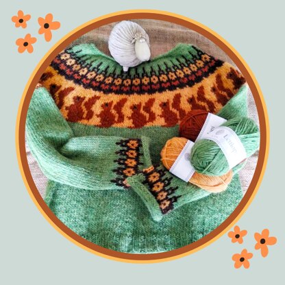Short rows are added to shape the neck and the stranded yoke is worked. The sleeves and body are separated and worked in the round.