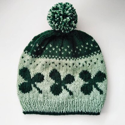 It’s knitted in the round from the bottom up. The hat starts with a 1x1 ribbing and continues with a colorwork motif featuring the famous Irish symbol: a shamrock.