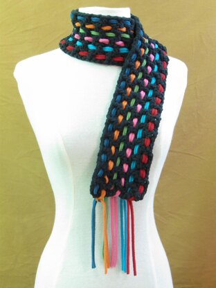 This scarf, designed in soft and snuggly PolarKnit, looks like stained glass with its bright colors and black background. It is simple to make, with contrasting color yarn woven through a crocheted mesh framework. I like the rainbow look, but you could choose from 1-6 colors to weave. Each channel requires 4 yards of yarn (doubled over if you're using the same color; 2 yards each of 2 colors if you want to mix colors within a channel).