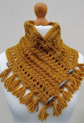 It uses approximately 300 yards of light worsted (DK) or worsted (aran) weighted yarn including the fringe.