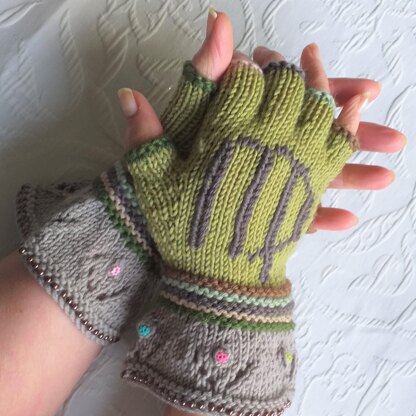 For Earth sign Virgo, I have used shades of green but obviously this is open to individual interpretation of the relevant colours. The mittens feature a lace flower border & a beaded edging with the Virgo symbol (worked in duplicate stitch) added to the finished mittens.