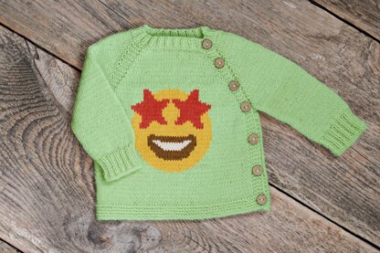 This beginner-friendly pattern helps you create a cozy, top-down baby cardigan with an adorable Star-Struck Emoji embroidered on the front. The cardigan is worked in one piece from the neckline down, with raglan shaping and a charming asymmetrical front closure along the left raglan line. The pattern includes row-by-row written instructions, making it perfect for beginners or knitters who want step-by-step guidance. You can print it and check off each row as you go! You’ll begin with neckline shaping using short rows, continue with raglan increases, work the sleeves flat, and then finish the body.