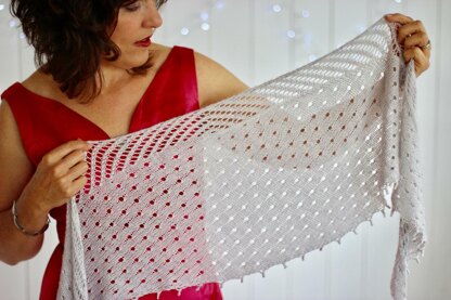 Stardust will keep your interest peaked, growing organically from one side to the other with a slightly assymetrical crescent shape, a string of picot points and a mirrored lace panel at the top edge.