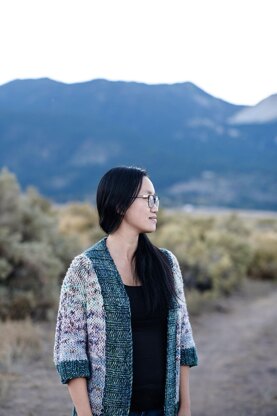 Perfect for those cold days when a jacket is too much or for layering under a jacket when gazing at the stars on cold nights. This cardigan is worked from the top-down with a simple seed stitch detail down the arms and sides. There are instructions to incorporate the fade as shown in the sample or it can be completed in one color.