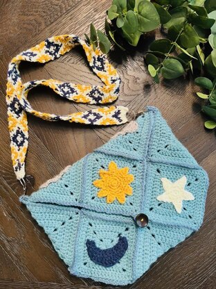 This Super cool Sling bag is made using filled granny squares with Sun, Moon, Star, Clouds Motifs. This bag isn't just pretty—it's practical too, with a soft lining that keeps all your treasures safe and snug. It comes with interchangeable tapestry crochet strap, so you can mix and match with your outfit! Written + Photo tutorial with Schematic pattern included.