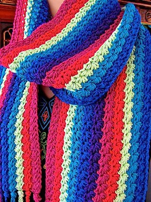 As I prepare class materials to teach "A Star Stitch for Every Purpose" at this year's [national crochet guild conference][1], I celebrate a 19th century Star stitch with this scarf. It's designed to offer maximum color fun because there are zero ends to weave in, and no switching between attached colors. It's finished with fringe-as-you-go edges.
