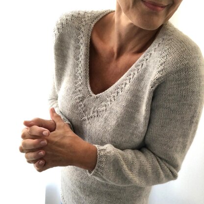 A flattering and feminine sweater with unusual raglan details. For a feminine appearance, knit the sweater with waist shaping, for a cooler look in A-line or straight (all options in the pattern)… Choose from two options for the sleeves in a moderate balloon shape or classic.