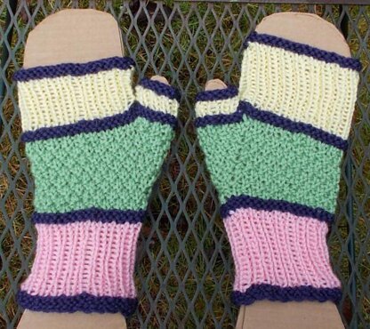Fun and colorful mitts that can be quickly knit using up the odds and ends in your stash. Perfect for gifts! Ribbing at the cuffs and hands alternates with a moss stitch section, where the thumb shaping is worked, with each section separated by a reverse stockinette stitch welt.