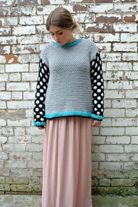 Statement sleeve jumper (2 colour honeycomb cable) which can also be worn as a jacket. Knit this design and wear it with the feature bow at either the front or back neck. Keep the back detailing but fasten the bottom hem together for a less open back.