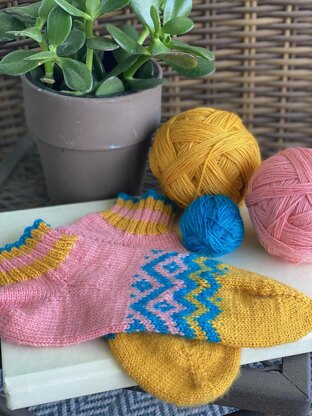 Stay Cool Shortie Socks are just right for warmer months. Inspired by friendship bracelets, the colorwork design across the instep hugs to keep the sock in place. Gather up those odd balls or mini skeins of fingering weight yarn! Stay Cool Shortie Socks has both toe-up and cuff-down versions & comes in three sizes. The heel is a short-row heel.
