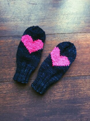 There is a chart included for the heart motif. Sample mittens were knitted in Malabrigo Mecha with Madelinetosh DK held double for the contrasting color.