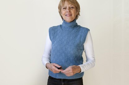 Introducing Stepping Out, an aran-weight, textured vest – or two vests, it seems, as I knit it twice with different yarns, just to see. This design is worked bottom-up, and in-the-round mostly, up to the armholes where front and back panels are knit separately and flat. Its AlternatingGarter Rib stitch pattern, comprised of knits and purls, is easy to remember, with rows calculated to ensure an easy transition to the same Garter Rib of its cozy collar. One pattern, two yarns, two personalities – both favorites now, and fun. Enjoy!