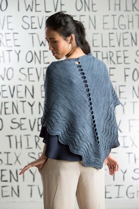 A chain of large eyelets along the spine of this shawl both shapes it and creates a spectacular detail on the smooth stockinette ground. The shawl is trimmed with a band of wave stitch that softens the bold design.