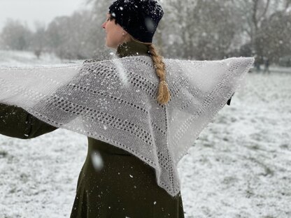 Light as a cloud, delicate like a snowflake, warm like a hug, all we can wish for in a shawl. Using less than 50g of silk mohair lace yarn it’s a small and portable project. Even though the stitches are large and open, the fluffy yarn traps the heat and is surprisingly warm.