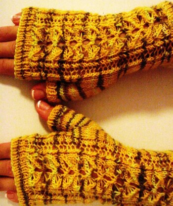 It can be lengthened (shortened) at the wrist or fingers by adding (decreasing) repeats of the chart before the thumb gusset.