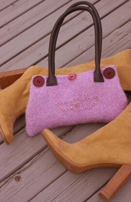 For knit bag: four large buttons (all same size and color); 1 smaller button for closure; 10 g Japanese seed beads in coordinating color(s); sewing needle and thread in contrasting color; one set leather purse handles