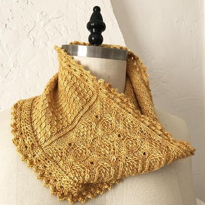 The Stonelace Cowl incorporates a geometric top and bottom edging, with an Aran Lace and textured body. An alternated version with a garter stitch border is also included.