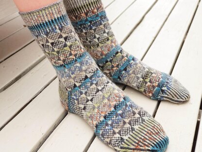Stone's Throw Sock Knitting pattern is a unique stranded sock pattern, which is an ideal way to get familiar with Fair Isle Sock Knitting. The entire sock is knit using two colours, resulting in an extremely comfortable and durable sock. Only two colours are used throughout. The clever use of two multicoloured yarns gives endless possibilities for variation. The floats are very short, so it's easy to get even tension. Sizes: average adult 9" foot circumference, length is adjustable, the instructions make a sock that will fit a men’s 41 - 43 or 8 - 10 Tip: A smaller foot circumference is achievable by going down a needle size or two, do a swatch to check.