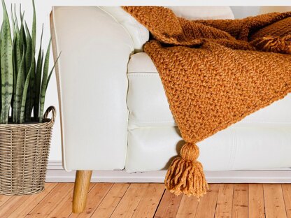 Cozy throw made in super chunky yarn. Quick and easy project works up really fast. The throw is finished off with big squishy tassels in the corners.