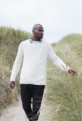 The quintessential “Irish Fisherman” sweater is given modern proportions for both men and women. Double seed stitch sets off the cable patterns; seaming gives structure to the easy fit of the sweater.