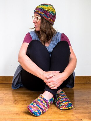 This hat was inspired by so many things: the fabulously fat and squishy Sookie yarn in the bright and happy Hanging with my Gnomies colorway; the cooling of the days and nights, and my resulting desire for toasty warm snuggly knitted things; and finally, my very recent reading of Elizabeth Gilbert's Big Magic. "One of the oldest and most generous tricks that the universe plays on human beings is to bury strange jewels within us all, and then stand back to see if we can ever find them." Now, these slippers might not bring out those strange jewels hidden within yourself, but the comfort you receive from the making, gifting, and wearing of them might just inspire some of that within yourself.