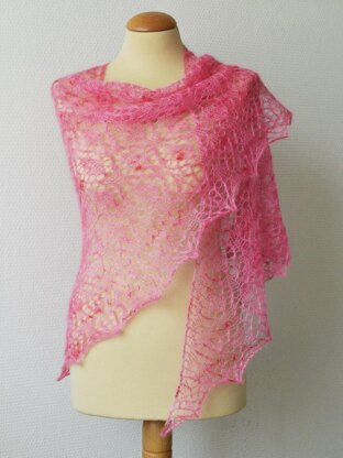 The gorgeous color of this kid silk yarn reminded me of the wonderfully bright plumage of the Strawberry Finch, a cute little bird found throughout Asia. What better way to show it off this gorgeous yarn than with all-over lace? Of course, this shawl can also be knit in fingering-weight yarn.