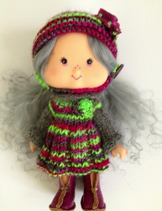 This is my own pattern that fits Vintage 5" Strawberry Shortcake dolls. It is a helmet, fine mohair sweater and pleated pinafore dress. All items are knit in one piece from the top down. You can decorate them like me with some trims to make them extra pretty!