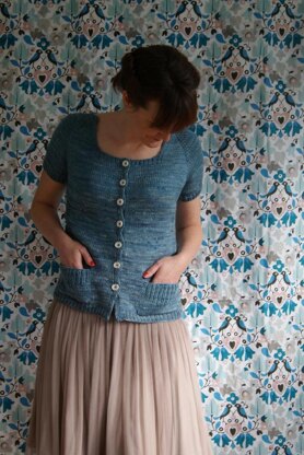 Streamside is a top down raglan worked in one piece, except for the optional patch pockets. A simple rib pattern is used to form waist shaping. In the sample it is set at an empire waist height, if you would prefer the shaping to fall at your natural waist, simply work 1 1/2 to 2” longer before beginning the rib pattern.