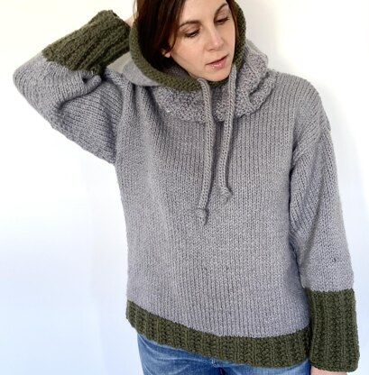 Oooh, this is my new FAVORITE sweater! This sweater is knit in a chunky weight yarn with a warm and cozy cowl and a hood that looks great up or down. The hood has a drawstring I-cord so it can be worn loose or pulled tighter. This hoodie can be worn with just about anything! It has a simple and loose shape to the body with a wide rib trim that adds style and shape.