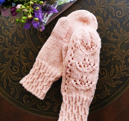 Knitted seamlessly on circular needles or double point needles bottom-up, these mittens work up in no time because there’s only a couple lace flower stitch repeats.