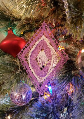 Using crochet cotton this decorative piece is 5 inches tall and 3.5 inches wide. (13 by 9cm). Size can be easily adjusted by using a heavier weight yarn and larger needles!