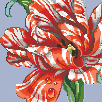 By Barbara Baatz Hillman. This gorgeous Parrot Tulip in Big Stitch is the companion piece to our Striped Parrot Tulip design #1258. This floral by Barbara Baatz Hillman is a cropped image of the tulip in full bloom and if stitched on 6 count fabric it would measure 16” x 16”. If stitched on 14 count, it comes out to be 6 7/8” square. Either way, this is a bold and beautiful design.