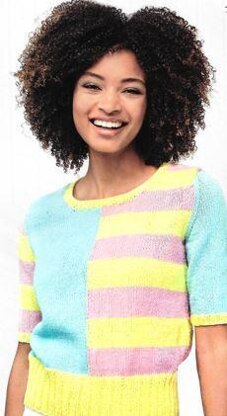 This is a stripes and blocks jumper, originally published in Lets Knit. It is a simple pattern on the body and stripes on the sleeves. 2 x 2 rib edges. Fine for a knitter able to do simple intarsia. Photos Lets Knit.