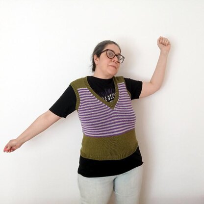 The eerie and slightly spooky music and lyrics of Stripsearch by Faith no More work well with my emotions during the first couple of months of lockdown here in Milano, right next to the center of the Italian Covid-19 outbreak. I found knitting on this vest relaxing. The strip motif kept the interest up while not making the knitting too complicated. The vest is knitted top down from the shoulders, the front has a taller striped section, while the back has some light waist shaping (no shaping is present on the front). Due to the top down construction, feel free to make the vest longer or shorter.