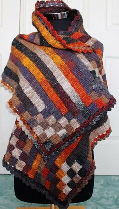 Crochet pattern for a warm stripy entrelac wrap. Simple Tunisian stitch worked using a standard crochet hook.