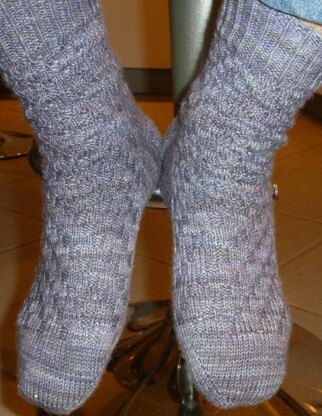 This classic design uses only knit and purl stitches to create an interesting spiraling effect, with the socks being mirror images of each other. It was originally designed for my husband who doesn’t like his socks too fussy, but it has enough interest to stop you being bored while you make it. It works well with plain, tonal or self-striping yarns.