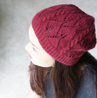 Worked from the brim to the crown, this slouch hat features a lacy leaf pattern and simple cable. Cashmere yarn makes this a luxurious hat to spoil yourself or a friend.