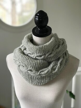 Lightweight easy cabled cowl knitted flat and seemed together after blocking.