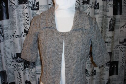 I love shrugs, simply because they are so versatile, you can dress them up or dress them down. With way it is a beautiful addition to your wardrobe. The cables are a perfect high light and the small collar adds some class. 6 balls of Plymouth yarn encore worsted weight in color 194 are required. I also used Ice Yarns, favorite in color 23889, 5 balls to make another one and it is the same texture. You will love it
