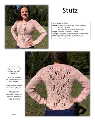 Stutz is a classic cardigan sweater with a fun lace and cable pattern. This is knit top down and is super-fast to knit, with no ease. This pattern is suitable for bulky weight yarn.
