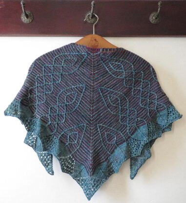 Stutzen is a triangular shawl, inspired by the calf gusset patterns in traditional twisted stitch stockings, called stutzen. These cables are created with traveling slipped stitches worked over a striped garter stitch backdrop. A lace border flows from the cable pattern and ends with a scalloped edge.