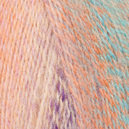 This charming lace weight yarn is perfect for making delicate shawls and accessories. Its blend of acrylic, wool & mohair gives it a very light and delicate feel while its colour swirl nature knits up to reveal beautifully subtle colour changes. Each garment takes just a single ball in the smallest size. Feather light & gossamer soft.