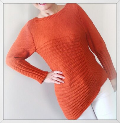 The sweater body is knitted in sideways with an asymmetric hemline. The sleeves are made from top down using contiguous set-in sleeve technique to help forming a more comfortable boat neckline.