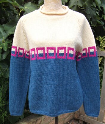 A striking but comfortable over-sized raglan sweater. It is worked in stocking stitch with a super smart geometric band of colour-work. The neckband has a really neat little roll-over edging. Have fun choosing your colours!
