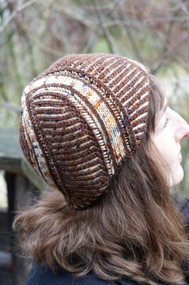 Subduction Zone Hat is a reversible design worked in two-colour brioche stitch with stripes of double knitting. The wavy brim and spiralling movement of the stripes over the brioche background are achieved with decreases and increases placed at the boundaries of the different stitch patterns.