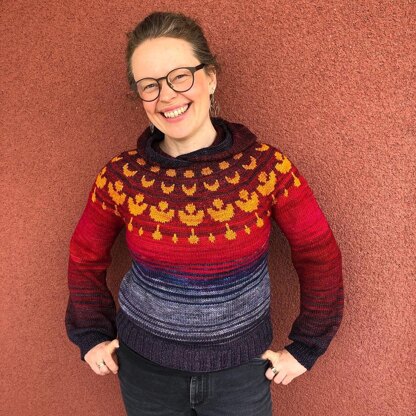 This hoodie is worked top-down in the round, like a classic yoked sweater. Hood is added at the end. In the pattern there is a description for color fading using 7 different colors but there is room for a lot of artistic freedom to use more or fewer colors.
