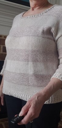 A fun bottom up pullover with subtle stripes and delicate lacy ribbing. The pullover begins at the bottom, is worked in the round until the sleeve separation, then worked back and forth to finish the bodice. The sleeves are picked up at the armhole and worked in the round down to the cuff.