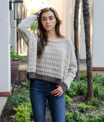 This oversized boxy sweater design is so easy to wear it only comes in two sizes. The larger gauge means it knits up fast and the generous boxy fit flatters everyone, making this a perfect gift knit, after you knit your own of course. Detailed lacy stripes and a split hem add a little sweetness and a pop of color. Options are included for either a v-neck or crew. The top is worked in pieces from the bottom up with drop-shoulder sleeves. Simple eyelet stripe is written. Pattern is designed for knitters of all skill levels. Shown in Size XS-L with 28"/71 cm positive ease.
