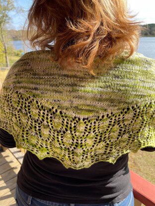 Summertime in Alberta means the Aspen trees take over. This colorway is a perfect representation of those beautiful trees of my childhood. The lace border is worked first, then the short-row body; then a simple garter edging.