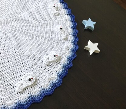 Pictured blanket measures around 28” / 71 cm in diameter, the size can be adjusted very easily.